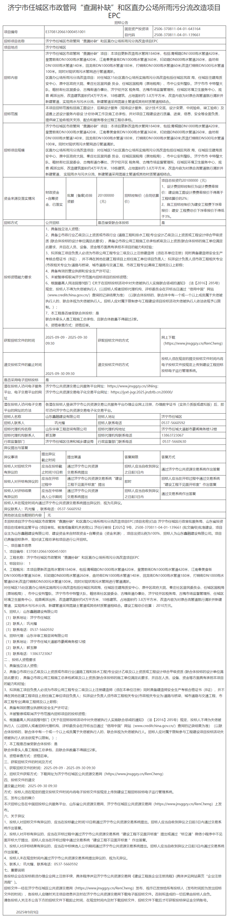 本招标项目济宁市任城区市政管网“查漏补缺”和区直办公场所雨污分流改造项目EPC(项目名称)已由 济宁市任城区行政审批服务局、山东省投资项目在线审批监管平台 (项目审批、核准或备案机关名称)以 济任行审投【2025】9号、2508-370811-04-01-139661 (批文编号)批准建设,项目业主为山东鑫融建设有限公司,建设资金来自财政资金+自筹资金(资金来源),项目出资比例为100%,招标人为山东鑫融建设有限公司。项目已具备招标条件,现对该工程总承包项目进行公开招标。