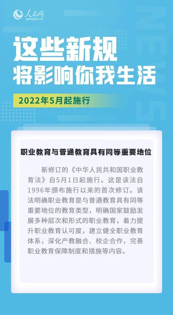 法律明确职业教育与普通教育具有同等重要地位,城乡居民人身损害赔偿标准统一,禁止销售除烟草口味外的调味电子烟……5月,这些新规实施 将影响你我生活。