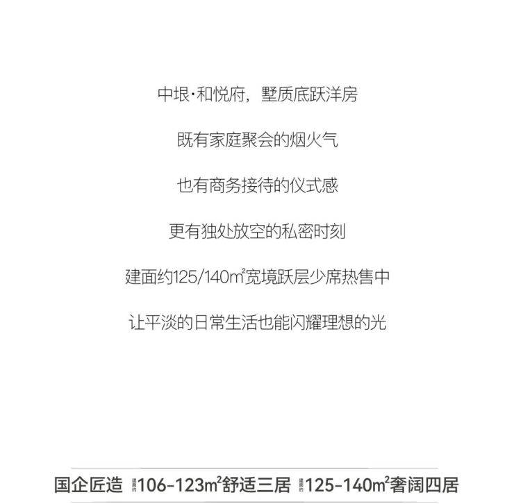 中垠·和悦府墅质底跃洋房,既有家庭聚会的烟火气,也有商务接待的仪式感,更有独处放空的私密时刻。建面约125/140㎡宽境跃层少席热售中,让平淡的日常生活也能闪耀理想的光。