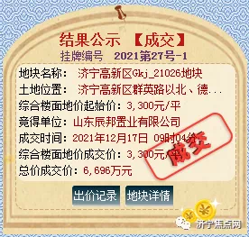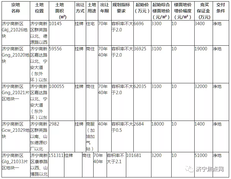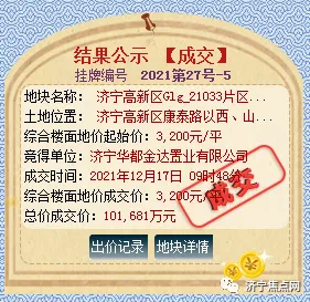 土地位于:济宁高新区康泰路以西、山博路以北;土地面积:151311㎡(约227亩);土地用途:商住用地;出让年限:商业40年、住宅70年;容积率不大于2.1;起始价:101681万元,综合楼面价起价:3200元/㎡;交付条件为净地;最终成交价为:101681万元(约448万元/亩),综合楼面地价成交价:3200元/㎡;溢价率:0.0%;