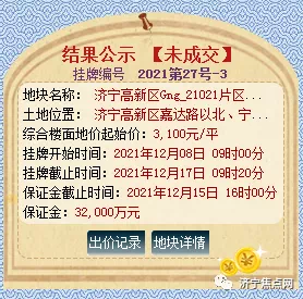 土地位于:济宁高新区嘉达路以北、宁安大道(东外环)以东;土地面积:100055㎡(约150亩);土地用途:商住用地;出让年限:商业40年、住宅70年;容积率不大于2.0;起始价:62035万元,综合楼面价起价:3100元/㎡;交付条件为净地;因无竞买方出价,本地块流拍;