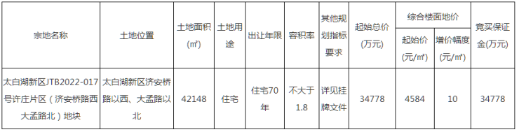 土地位于:太白湖新区济安桥路以西、大孟路以北;土地面积:34778㎡(约63亩);土地用途:住宅用地;出让年限:70年;容积率不大于1.8;起始价:34778万元,综合楼面价起价:4584元/㎡;因无竞买方出价,本地块流拍。
