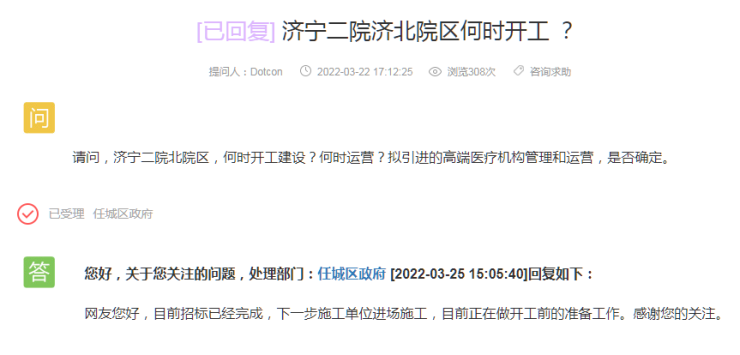 近日,搜狐网济宁小编在济宁市网络问政平台上注意到有网友提问:请问,济宁二院北院区,何时开工建设?何时运营?拟引进的高端医疗机构管理和运营,是否确定。