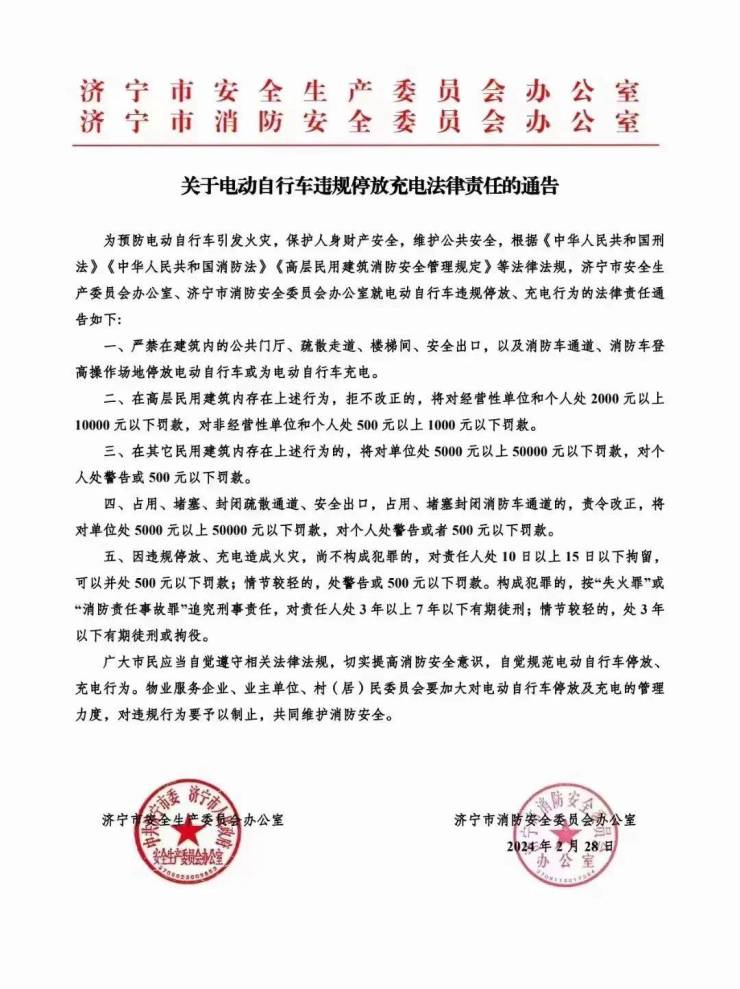 搜狐网济宁小编了解到:2024年2月28日,中共济宁市委济宁市人民政府安全生产委员会办公室、济宁市消防安全委员会办公室发布关于电动自行车违规停放充电法律责任的通告。原文如下: