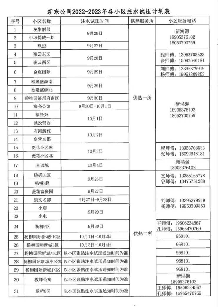 注:如遇特殊情况,具体试压时间以小区张贴的试压通知为准,公司统一服务热线:968101。
