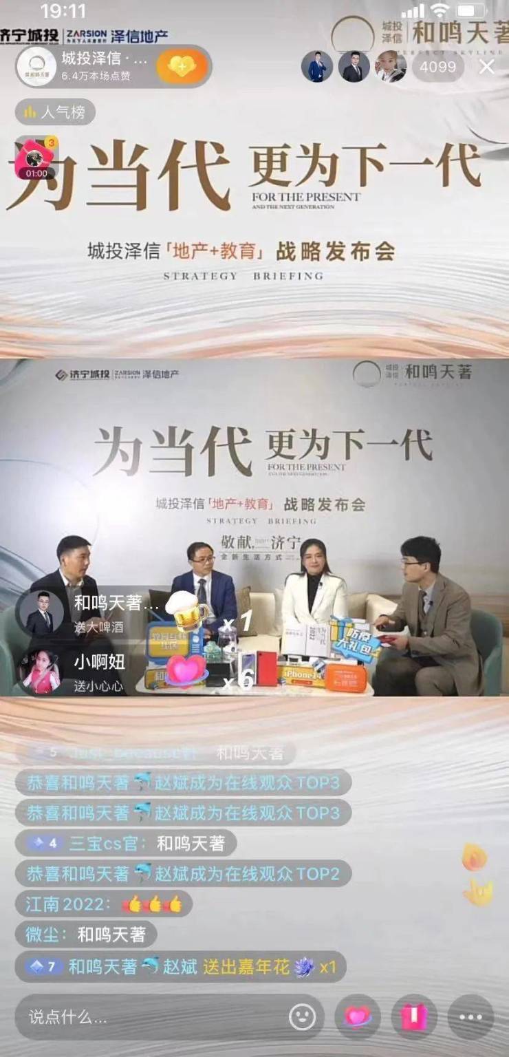 2022年12月17日,和鸣天著“为当代 更为下一代” 城投泽信「地产+教育」战略发布会圆满落下帷幕!活动当天,和鸣天著直播间一小时全网在线观看超过2万,点赞量超10万。