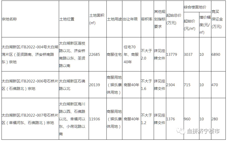 注:太白湖新区JTB2022-004号太白湖湾片区(圣贤路南、济安桥南路东)宗地受让人商业部分需自持1万平方米用于总部经济建设,竞得后与太白湖新区投资促进中心签订监管协议。