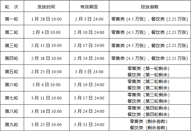 2025年1月28日—3月31日,共发放9轮,每轮为一个周期,每人每个发券周期每个面值消费券可分别领取一张,先到先得,领完为止。上一轮由于消费券逾期未使用而沉淀的资金,结转到下一轮继续投放。活动期间,活动组织方将根据活动执行、市场反馈情况,适当调整活动规则和时间。