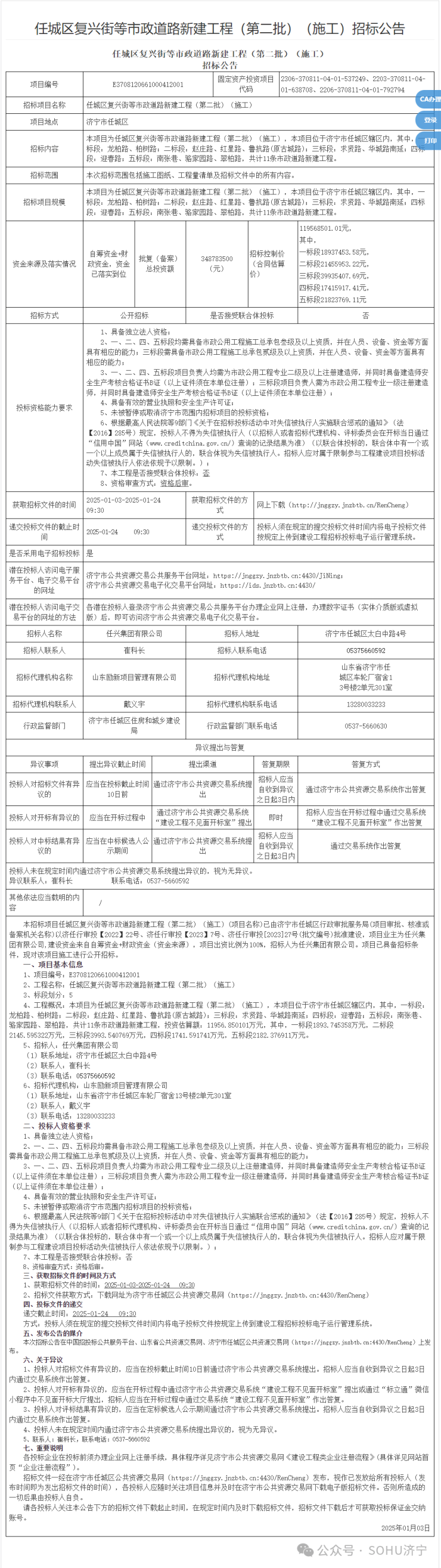 估算投资1.2亿元!济宁市任城区11条市政道路新建工程招标公告发布