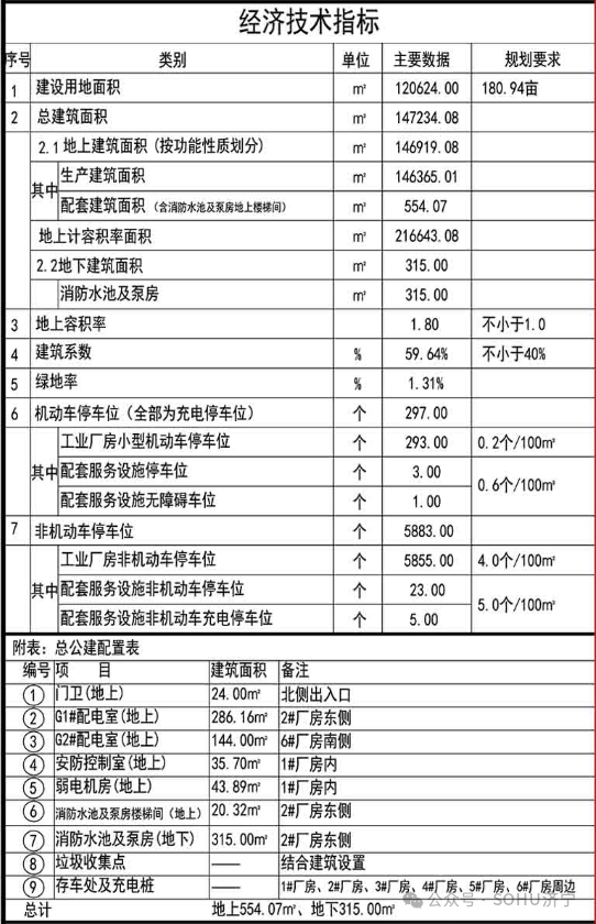 规划建设用地面积为12.06公顷,总建筑面积147234.08平方米,其中地上建筑面积146919.08平方米,地下建筑面积315.00平方米;容积率1.80,建筑密度59.64%,绿化率1.31%,机动车停车位共297辆(全部位于地上),非机动车停车位5883辆(全部位于地上)。