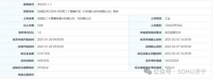 土地位于:任城区二十里铺街道兴科路以东、科技路以北;土地面积:120624㎡(约181亩);土地用途:工业用地;出让年限:50年;容积率不小于1.0;起始价:4283万元,综合楼面价起价:355元/㎡;最终成交价为:4283万元(约24万元/亩),综合楼面地价成交价:355元/㎡;溢价率:0.0%;