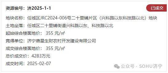 地块名:任城区JRC2024-006号二十里铺片区(兴科路以东科技路以北)地块【济宁唐星生财农村开发建设有限公司竞得】