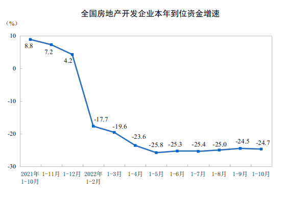 国家统计局数据显示,1-10月份,全国房地产开发投资113945亿元,同比下降8.8%;其中,住宅投资86520亿元,下降8.3%。从2021年1-10月以来的情况看,这一降幅处于近一年以来的最低点。