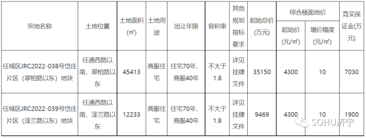 济宁城区挂地!搜狐网济宁小编从济宁市自然资源和规划局了解到:经济宁市人民政府批准,济宁市自然资源和规划局决定以网上挂牌方式出让任城区2宗国有建设用地使用权,土地用途为商住用地;土地面积57646㎡,约86.5亩;起始价为44619万元。经竞价后,两地块均成交,成交价为44782万元。