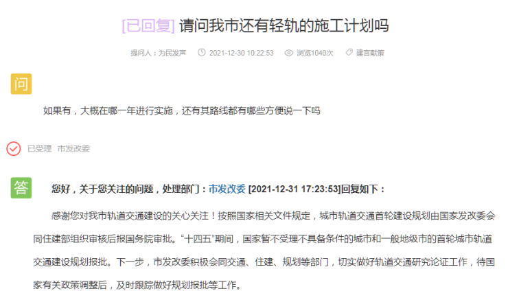 近日,搜狐网·搜狐焦点济宁小编从济宁市网络问政平台注意到有网友提问:请问我市还有轻轨的施工计划吗,大概在哪一年进行实施?