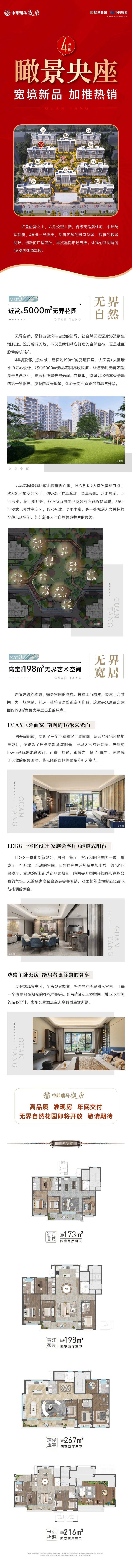 中玮瑞马观唐4#楼紧邻央景中轴,建面约198m²的宽境四居,大面宽+大窗墙比的匠心设计,将约5000m²无界花园尽收眼底。让您无时无刻不置身于自然之中,与园林央景亲密无间。在这里,您可以尽情享受清晨的第一缕阳光、夜晚的满天繁星,让心灵得到真正的滋养与升华