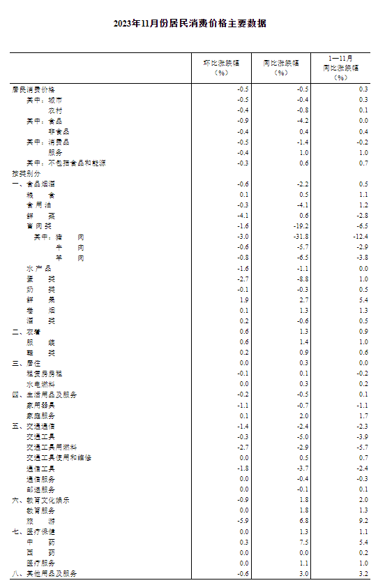 环比下降0.5%!2023年11月份国内居民消费价格数据出炉