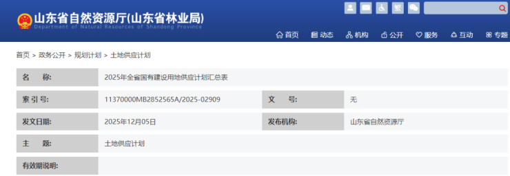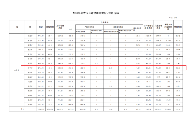 搜狐网济宁小编相关渠道获悉:近日,山东省自然资源厅发布2025年全省国有建设用地供应计划汇总表。其中,济宁市合计用地2756.92公顷,商服用地:145.36公顷;工矿仓储用地:1034.03公顷;住宅用地:591.3公顷(含商品住宅用地:581.91公顷;保障性租赁住宅用