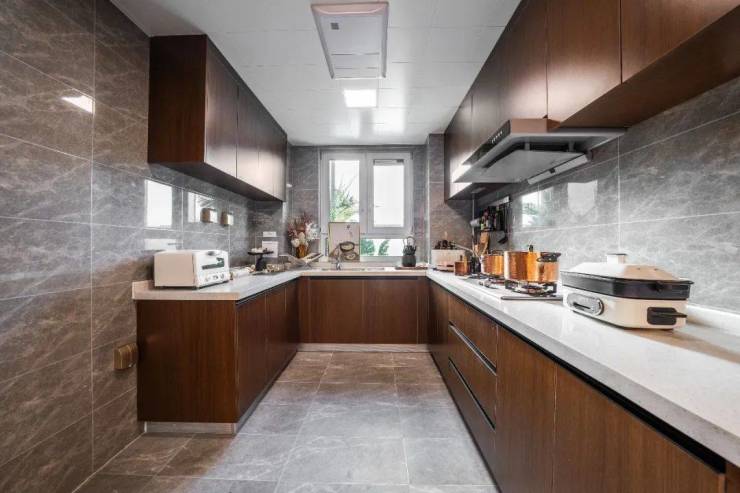 洗涤区、烹饪区及操作台、冷藏区等空间划分明确,功能配置充足,动线无缝衔接。超大的橱柜,完美收纳各类厨房用品,让日常烹饪更加高效、舒心。厨房台面特别做了防水沿设计,防止台面水外流造成柜体腐蚀。