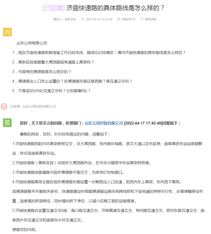 近日,搜狐网济宁小编在济宁市网络问政平台上注意到有网友提问: 济曲快速路的具体路线是怎么样的?