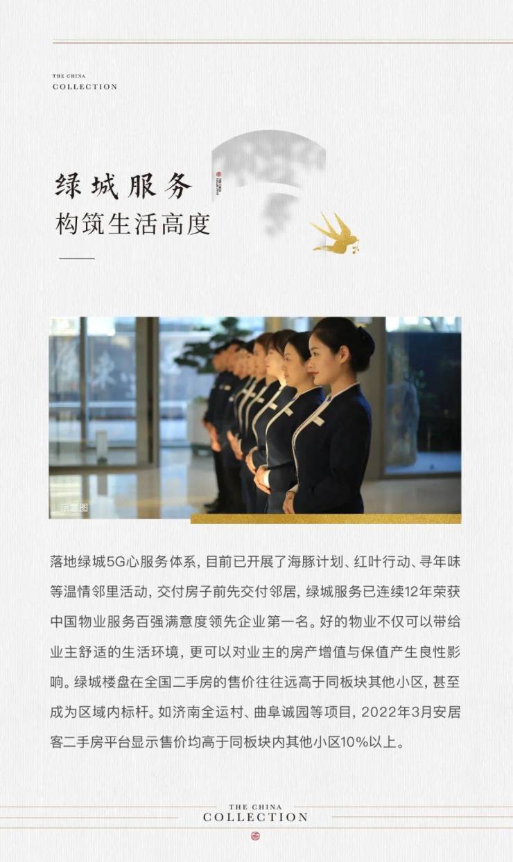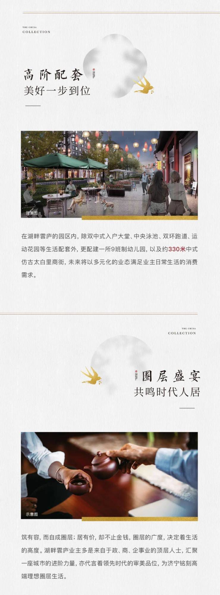 在城投绿城·湖畔雲庐园区内,除双中式入户大堂、中央泳池、双环跑道、运动花园等生活配套外,更配建一所9班制幼儿园,以及约330米中式仿古太白里商街,未来将以多元化的业态满足业主日常生活的消费需求。