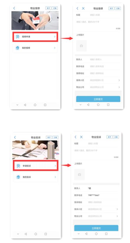 3、进入“物业报修”或“物业投诉”页面,“报修申请”、“申请投诉”页面输入报修信息或投诉信息后,点击“立即提交”即可。