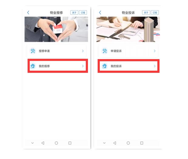 4、点击“物业报修”、“物业投诉”中的“我的报修”、“我的投诉”,可以实时查看报修或者投诉进度哦。