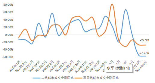 注:一线城市由于8月没有任何土地成交,因此只探讨二线城市与三四线城市的同比