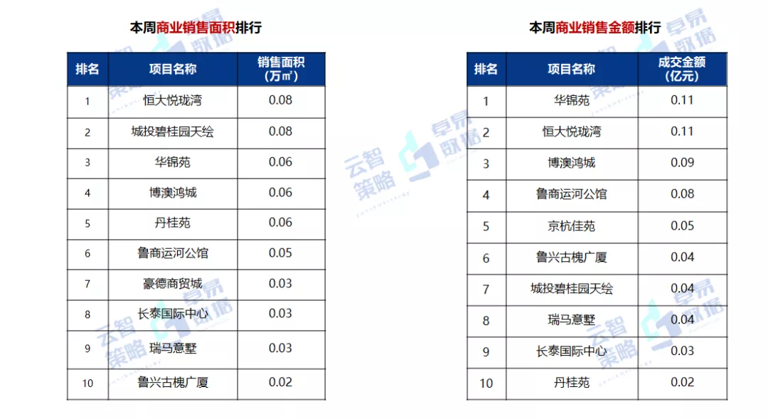 本周恒大悦珑湾项目以销售面积0.08万㎡,位居商业销售面积排行榜排名前列,华锦苑项目以销售金额0.11亿元,位居商业销售金额排行榜排名前列。