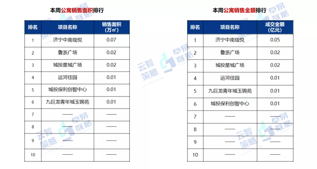 本周济宁中南珑悦项目以销售面积0.07万㎡,销售金额0.05亿元,位居公寓双排行榜排名前列。
