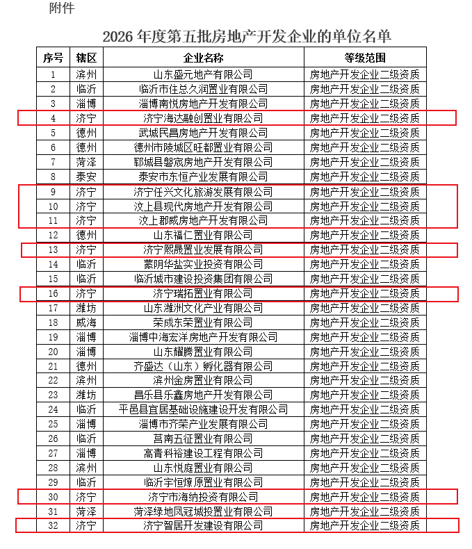 济宁8家!2026年度第五批房地产开发企业资质名单发布