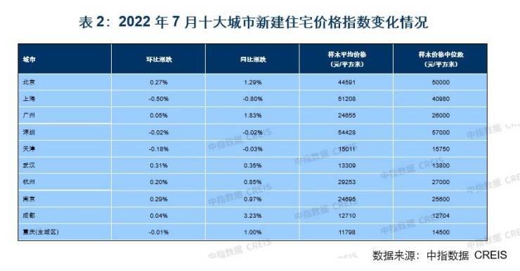 根据百城新建住宅价格指数对北京、上海等十大城市样本调查数据显示,2022年7月十大城市新建住宅平均价格为29356元/平方米,环比下跌0.08%。十大城市中,6个城市环比上涨,4个城市环比下跌。具体来看,武汉受高于城市均价项目入市带动,新建住宅价格环比上涨0.31%;南京、北京和杭州环比分别上涨0.29%、0.27%和0.20%;广州和成都新建住宅价格环比涨幅均在0.1%以内。上海受低于城市均价项目入市影响,新建住宅价格环比下跌0.50%;天津环比下跌0.18%;深圳和重庆(主城区)跌幅较小,分别为0.02%和0.01%。二手住宅方面,根据百城二手住宅价格指数对北京、上海等十大城市样本调查数据显示,2022年7月十大城市二手住宅平均价格为40414元/平方米,环比上涨0.10%,涨幅较上月扩大0.04个百分点。十大城市中,6个城市环比上涨,4个城市环比下跌。具体来看,成都和上海环比涨幅较大,分别为0.55%和0.42%;北京、杭州、广州和天津环比涨幅在0.2%-0.4%之间。下跌城市中,武汉、深圳及南京环比分别下跌0.52%、0.39%和0.29%;重庆(主城区)环比跌幅较小,为0.09%。对于后市展望,陈文静指出,7月底中央政治局会议强调“要稳定房地产市场”,但“房住不炒”仍是房地产政策优化调整的底线;“因城施策”仍是政策推进的主要方式,强调用足用好政策工具箱。