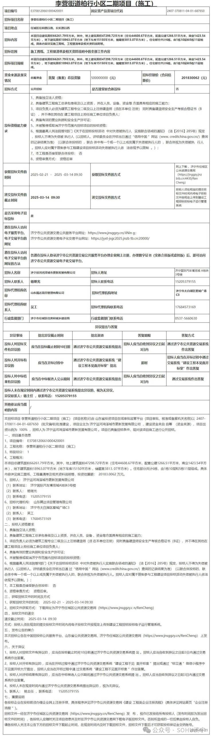 2025年2月21日,济宁市任城区李营街道柏行小区二期项目(施工)招标公告发布,项目位于任城区任和路以南、长虹路以西。该项目总建筑面积66261.79平方米。其中,地上建筑面积47298.72平方米(住宅44608.67平方米,配套公建1266.51平方米,商业1423.54平方米),地下建筑面积18963.07平方米(地下车库15150平方米,储藏室3813.07平方米)。住宅部分共计6栋,由1栋10层和5栋11层组成。具体内容详见施工图纸、工程量清单及相关资料说明等。合同估算价约2亿元。