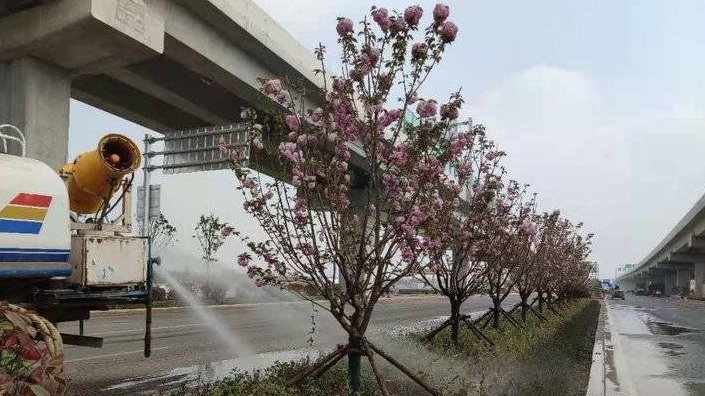在洸河路西延与西外环交汇处,该路段中央绿化带种植以基本完成,海棠花的绽放,使整个路段更具有生命力。驱车一路向北,还有部分路段正在进行建筑垃圾清理和回填种植土。