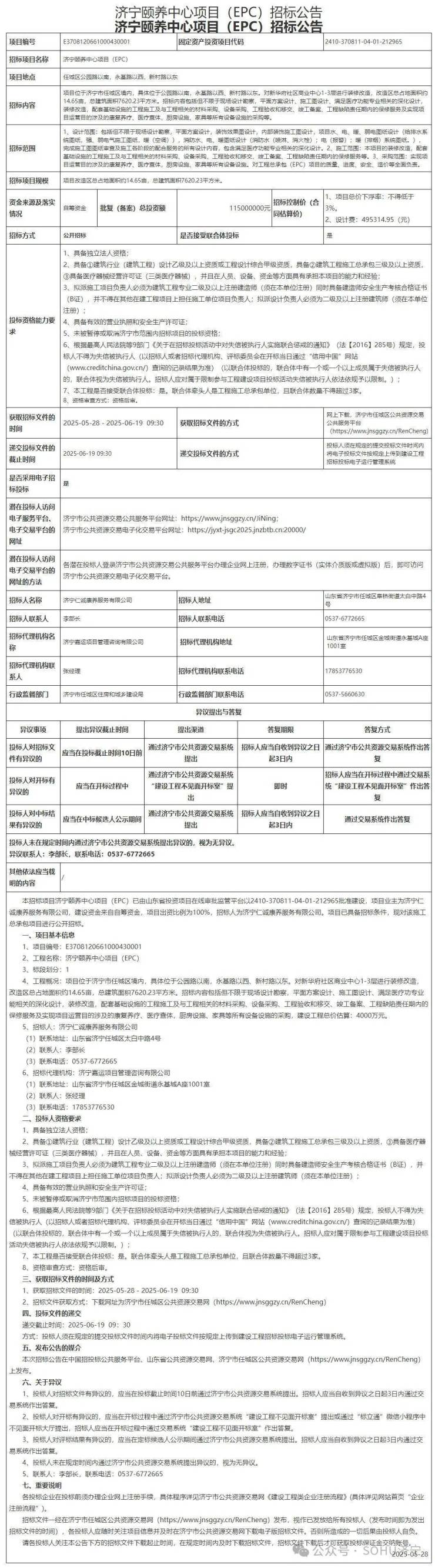 本招标项目济宁颐养中心项目(EPC)已由山东省投资项目在线审批监管平台以2410-370811-04-01-212965批准建设,项目业主为济宁仁诚康养服务有限公司,建设资金来自自筹资金,项目出资比例为100%,招标人为济宁仁诚康养服务有限公司。项目已具备招标条件,现对该施工总承包项目进行公开招标。