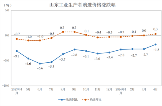 2024年4月份,山东工业生产者出厂价格同比下降2.2%,降幅比上月收窄0.7个百分点;环比由上月持平转为上涨0.4%。购进价格同比下降1.8%,降幅比上月收窄0.9个百分点;环比由上月持平转为上涨0.3%。1-4月份,工业生产者出厂价格同比下降2.6%,购进价格同比下降2.5%。