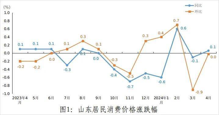 4月份,山东居民消费价格环比持平。其中,城市环比持平、农村下降0.1%;食品价格下降1.8%,非食品价格上涨0.4%;消费品价格下降0.2%,服务价格上涨0.3%。