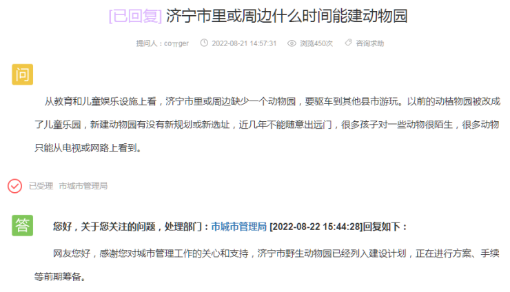 近日,搜狐网济宁小编在济宁市网络问政平台上注意到有网友提问:从教育和儿童娱乐设施上看,济宁市里或周边缺少一个动物园,要驱车到其他县市游玩。以前的动植物园被改成了儿童乐园,新建动物园有没有新规划或新选址,近几年不能随意出远门,很多孩子对一些动