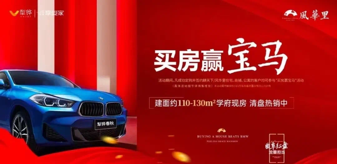 犁铧春秋·风华里,年终感恩回馈季,推出“买房赢宝马”活动,即日起至2022年1月16日,凡是成功定购并签约购买风华里住宅、商铺、公寓的客户,均可参与“买房赢宝马”活动(具体活动细节详询售楼处)