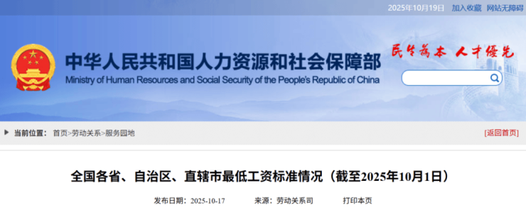 10月17日,人社部官网公布全国各省、自治区、直辖市最低工资标准情况(截至2025年10月1日)。