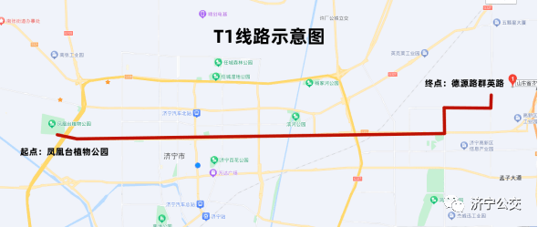 T1路:由“凤凰台植物公园”发车,沿洸河路向东至崇文大道,沿崇文大道向东至海川路,沿海川路向北至群英路,沿群英路向东至德源路,沿德源路向北至终点站“德源路群英路”。停靠站点(下行):凤凰台植物公园、开泰花园、梦园小区、市体育馆(南)、市建筑设计院、邮电新苑、市公安局、济宁联通、方圆忻居、圣都国际会议中心、高新区管委会、德源路群英路。