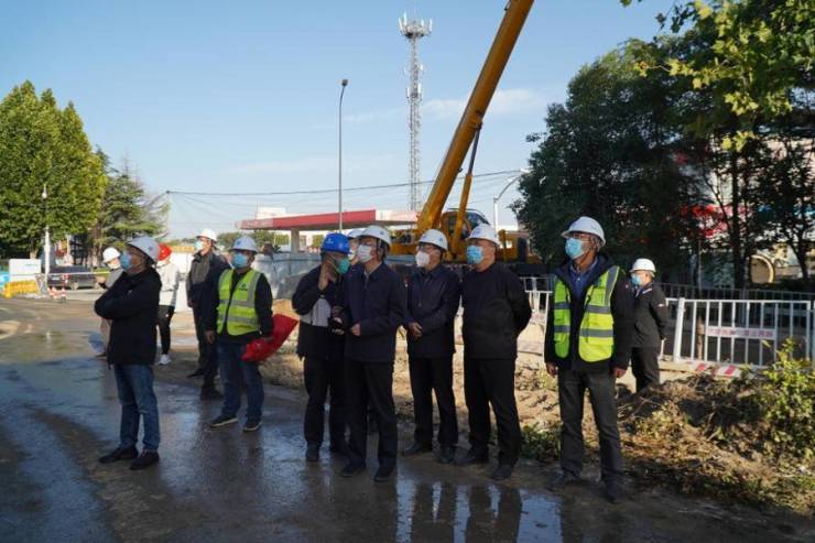 现场记者了解到,该片箱梁由一台320吨履带吊和一台260吨履带吊共同吊装完成。当日16时许,只见两辆吊车同时发力,巨大的预制箱梁缓缓从地面抬起,随着指挥人员一声令下,大禹西路高架桥首件预制箱梁精准落位,标志着该项目进入桥梁上部结构施工的新阶段。济宁市住建局副局长孙德化、市交通运输局副县级干部王允征、项目公司董事长邢金城、总经理王大伟现场指导。