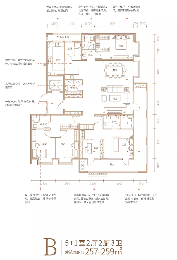 汇涛·世纪风景建面约257—259㎡奢阔大平层,考量居者各阶段需求,以“五室”尺度,有序的布局,给予每个家庭成员更多独立空间,妥帖安放生活。