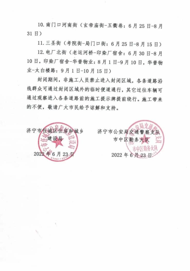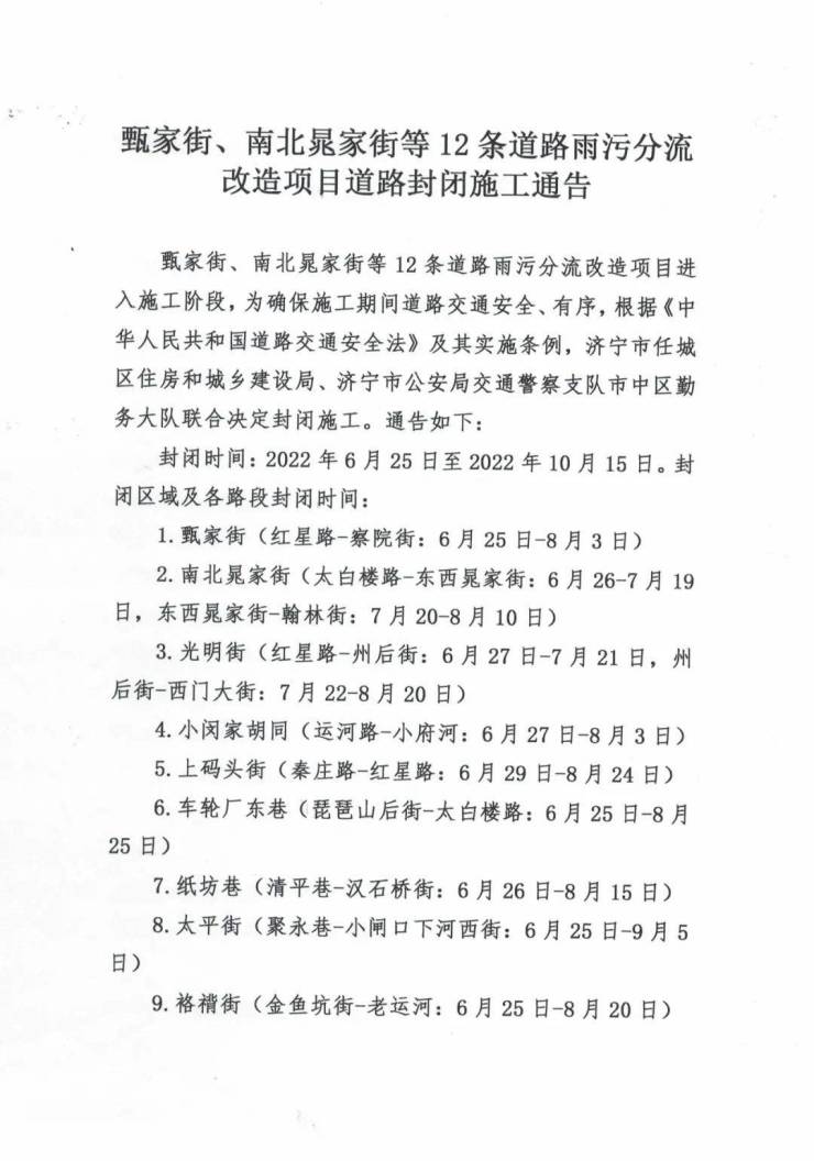 通告!任城区雨污分流改造项目道路封闭施工日期