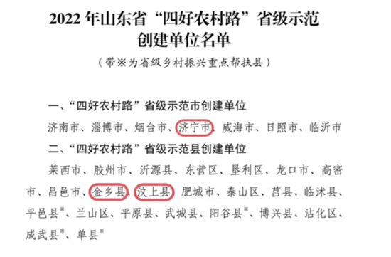 2月28日,山东省交通运输厅、山东省财政厅、山东省农业农村厅、山东省乡村振兴局联合印发《关于公路2022年度“四好农村路”省级示范市(县)创建单位名单的通知》,济宁市、金乡县、汶上县榜上有名。截至目前,济宁市已成功创建3个“四好农村路”全国示范县,1个“四好农村路”省级示范市,4个“四好农村路”省级示范县,“四好农村路”示范创建工作屡创佳绩,全市农村公路总里程达1.94万公里。