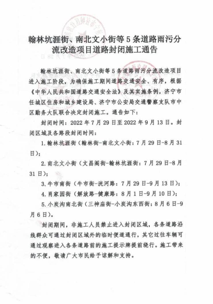 日前,记者从济宁市任城区住房和城乡建设局了解到,翰林坑涯街、南北文小街等5条道路雨污分流改造项目进入施工阶段,为确保施工期间道路交通安全、有序,根据《中华人民共和国道路交通安全法》及其实施条例,2022年7月29日至2022年9月13日期间进行封闭施工。