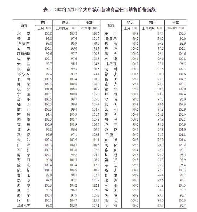 “一线城市需求支撑力强,加之新房限价因素存在,导致市场关注度长期保持在高位。深圳市场整体已处于反弹阶段,但由于前期政策力度较大,尤其是二手房参考价格等政策效力依然明显,市场恢复会偏慢,房价短期内的波动亦属常态。”张波表示。2022年6月70个大中城市新建商品住宅销售价格指数。截图自国家统计局官网
