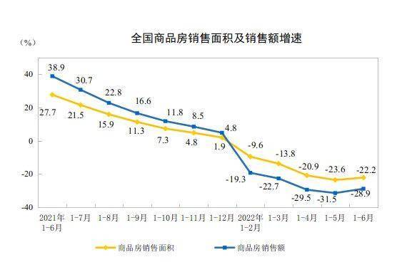国家统计局15日发布的数据显示,上半年,全国房地产开发投资68314亿元,同比下降5.4%;其中,住宅投资51804亿元,下降4.5%。全国商品房销售面积68923万平方米,下降22.2%;商品房销售额66072亿元,下降28.9%。