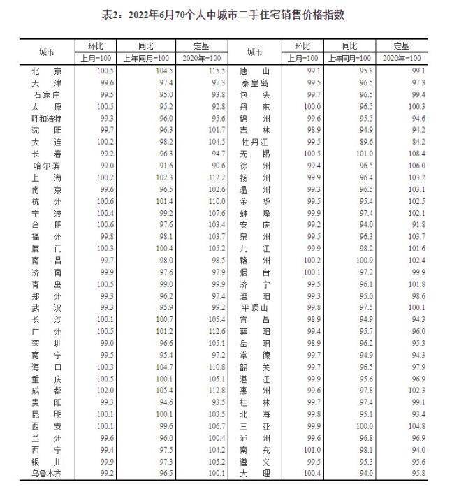 “当前市场的修复更多是一线和强二线城市的带动,预计后期修复将向周边二线及强三线城市传导,市场修复面逐步扩大。”贝壳研究院首席市场分析师许小乐认为。2022年6月70个大中城市二手住宅销售价格指数。 截图自国家统计局官网