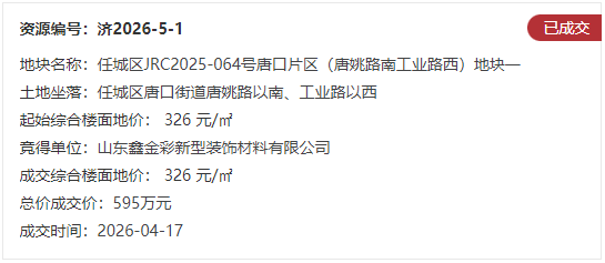 地块名:任城区JRC2025-064号唐口片区(唐姚路南工业路西)地块一【山东鑫金彩新型装饰材料有限公司竞得】
